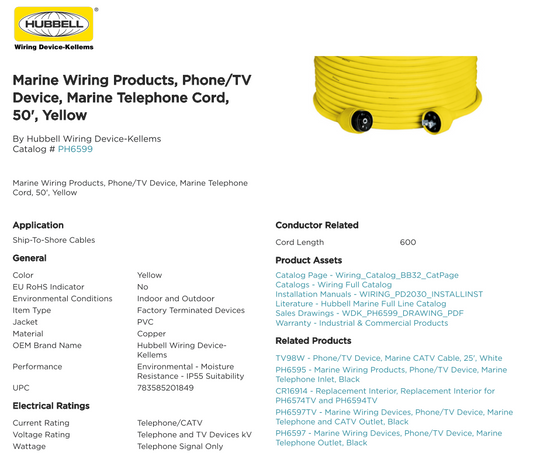 Hubbell, Marine Telephone Cord, 50', Yellow